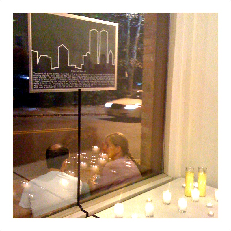 One year ago, on 1/11/11, we announced dispersed memorial, phase II to the world, nine months prior to the 10th year anniversary of the 9/11 events. We embarked on preparations, team expanding, logistics… working on the steps towards realizing the original ‘dispersed memorial’ proposal. We want to create moments of remembrance in as many places in the city as there were victims, while also reconstructing the lost views of New York City’s skyline (for more on this, visit our dispersed memorial website). In the process, what was the ‘project card’ prompted exchanges which began to happen on all corners of our nation. As the cards were held up to the light, ‘dispersed memorial’ was revealed, and stories about that day were shared. We are touched that there was a story shared with each exchange. Moments of remembrance have, and are still occurring across our nation. Thanks to Dan for compiling these images! thanks to all of you who have initiated moments of remebrance. Let us know, if you would like a set of ‘memory cards’ to share, and disperse (find out how to participate).