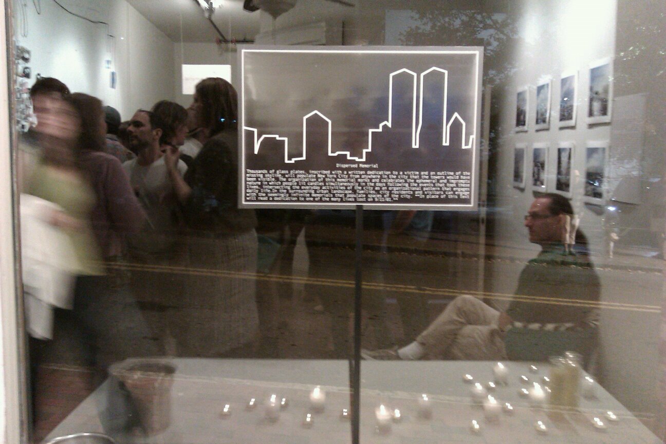 ‘memory cards’ which are being exchanged nationally prompt and assemble a conversation about the memory of lost lives and changed skyline during the events of September 11, 2001. At the exhibit this emerging collective memorial was unveiled also as an interactive exhibit in which visitors may also contribute. The concept for a later phase of the project is also on display. Thousands of glass plates, inscribed with a written dedication to each victim and an outline of the missing skyline, will populate New York City from anywhere in the city that the towers would have been visible. The project will be assembled online through the thousands of contributions from victims’ loved ones and residents or visitors of New York City.